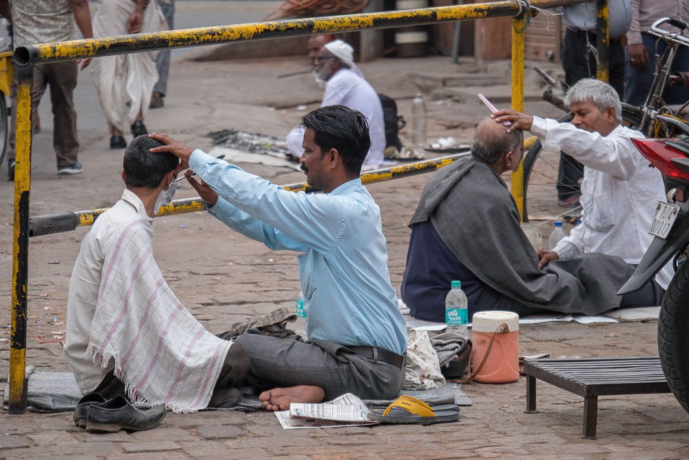 Barbers with customers on a street in Delhi